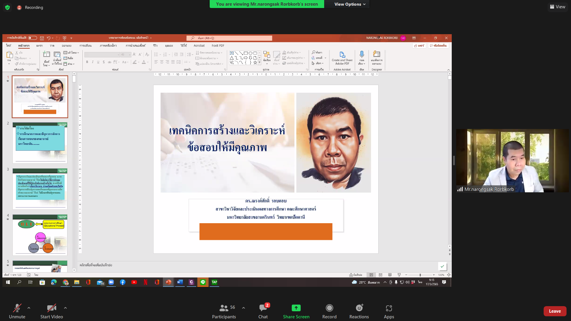 เมื่อวันอังคารที่ 17 พฤษภาคม 2565 เวลา 09.00 – 12.00 ณ ห้องประชุมชั้น 1 ศูนย์บริการการศึกษา จัดอบรม หลักสูตรหลักสูตร “เทคนิคการสร้างและวิเคราะห์ข้อสอบให้มีคุณภาพ” ให้กับอาจารย์ผู้สอน ผ่านระบบ Online Meeting โดยเชิญ อาจารย์ ดร.ณรงค์ศักดิ์ รอบคอบ ผู้เชี่ยวชาญทางด้านการวัดและประเมินผลทางการศึกษา เป็นวิทยากรบรรยาย