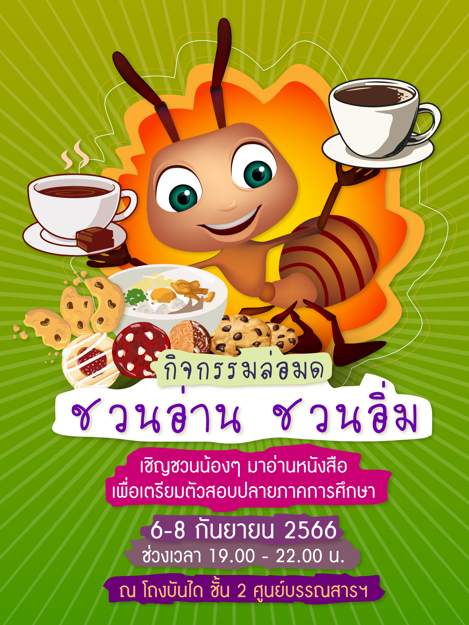 ศูนย์บรรณสารและสื่อการศึกษา จัดกิจกรรม "ส่งเสริมการอ่านหนังสือเพื่อเตรียมตัวสอบปลายภาค (กิจกรรมขนมล่อมด) ระหว่างวันที่ ๖ - ๘ กันยายน ๒๕๖๖ จึงขอเชิญชวนน้องๆ นักศึกษาร่วมกิจกรรมได้ตั้งแต่เวลา ๑๙.๐๐ - ๒๒.๐๐ น. ณ โถงบันไดทางเข้าห้องสมุด ชั้น ๒ ศูนย์บรรณสารฯ