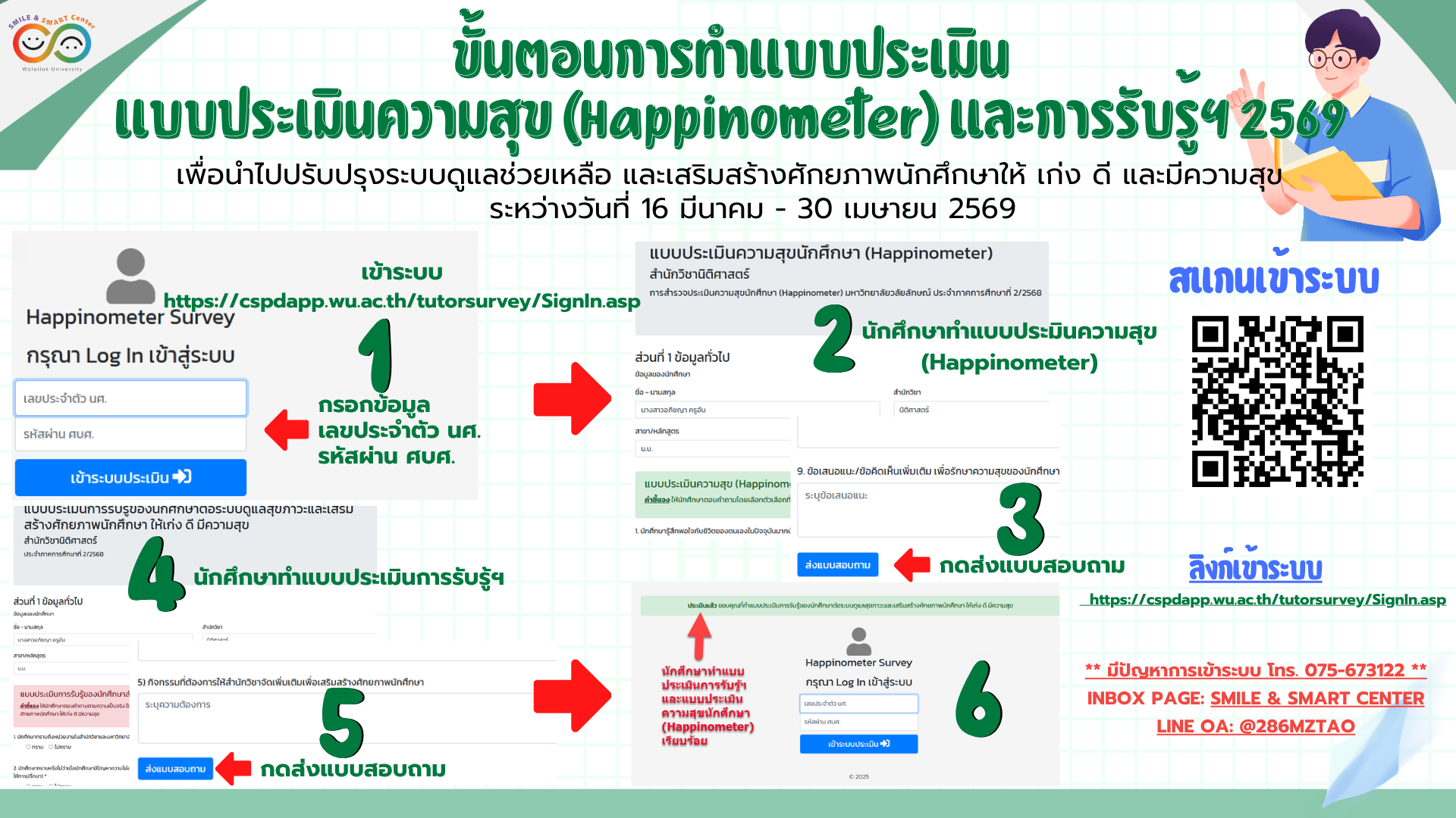 🍉ตามที่มหาวิทยาลัยวลัยลักษณ์ มีระบบดูแลและเสริมสร้างศักยภาพนักศึกษา ให้ "เก่ง ดี มีความสุข" นั้น จึงได้มีการประเมินผลเพื่อนำมาปรับปรุงระบบและพัฒนาให้มีประสิทธิภาพมากยิ่งขึ้น โดยให้นักศึกษาทำแบบประเมินระดับความสุข (Happinometer) และประเมินการรับรู้ของนักศึกษาต่อระบบดูแลสุขภาวะและเสริมสร้างศักยภาพนักศึกษา ให้ "เก่ง ดี มีความสุข" ประจำปีการศึกษา 2568 ขึ้น